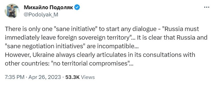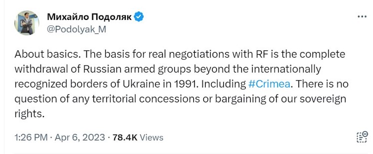 Once again, Ukraine supports diplomacy, but only after Russia completely withdraws its armed forces beyond the internationally recognised borders of Ukraine, including Crimea. This is what the adviser to the President of Ukraine, Podolyak repeatedly writes on his Twitter.
