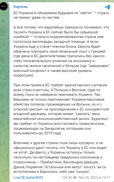 Another fabrication created by Russia's propagandist machine. Thus, Kartel wrote that Poland and Hungary were strongly opposed to Ukraine's EU membership due to bilateral ethnic issues in their relations. Politika Strany, in turn, provides systematic public explanations for why the EU does not consider Ukraine a member. The permanent posting of such narratives reflects Moscow's efforts to distort Ukrainians' perceptions of Ukraine's readiness to join the EU as well as the EU's willingness to access Ukraine.