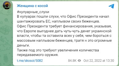 Also, numerous channels, such as ZeRada or Zhenshchina z kosoi, circulate stories claiming that "the EU will impose additional restrictions on Ukrainians, forcing them to return home." These debates intensified after rumors circulated that "Ukraine's government was holding secret talks with Europeans about returning Ukrainians' homes."