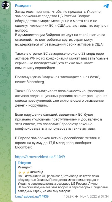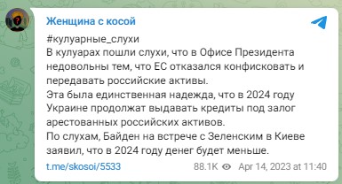 This narrative is twofold. The first is that "the profits from asset confiscation are Ukraine's only hope of receiving loans secured by arrested Russian assets." This sentiment is echoed by channels such as Zhenshchina z Kosoi. The second reason is that "the EU is reluctant to seize Russia's funds." According to Rezident, "the EU is actively seeking reasons to withhold the transfer of confiscated assets to Ukraine, citing delays in decision-making disguised as legal pretexts."