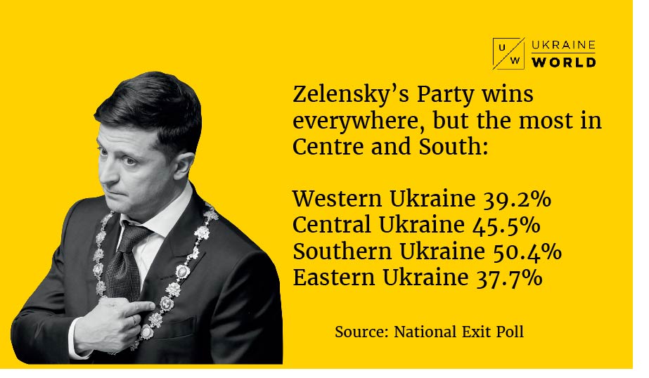 Although the results of the election in the party lists did not give “Servant of the People” over 50%, its landslide win of single-mandate constituencies (where individual candidates compete, and “the winner takes it all”) create grounds for even more impressive representation in Parliament. The results of voting in single-mandate constituencies form half of the Ukrainian Parliament (the other half formed by competition between the parties). This explains why 42% of the voting for party lists can translate into over 50% in absolute number of seats, which Servant of the People has taken.