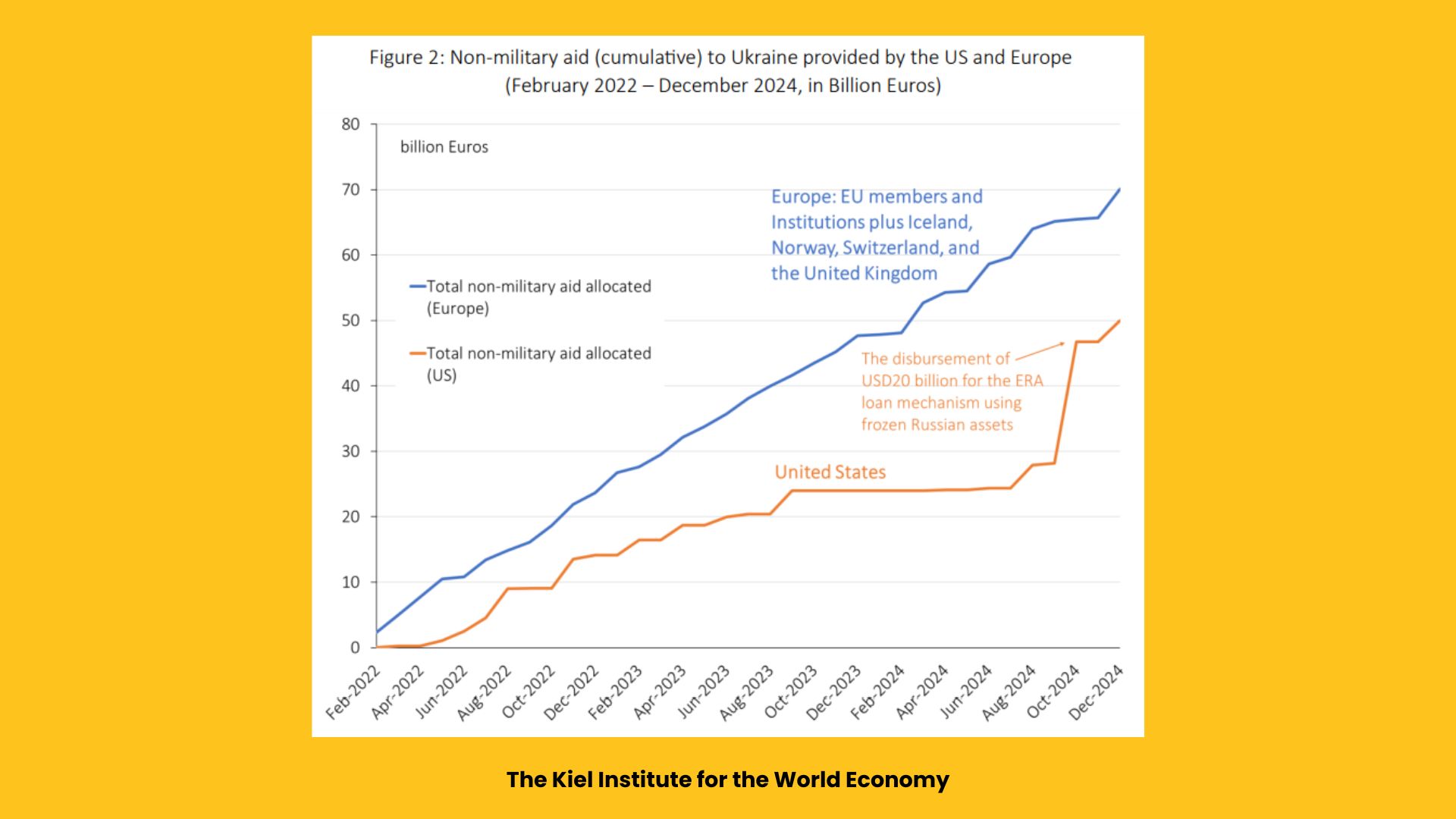 The USA "aid crisis" is even more evident in the financial and humanitarian sectors. While European assistance has followed a steady upward trend, USA non-military aid remained stagnant for nine months and only resumed in late 2024. This was largely due to the disbursement of a $20 billion loan, known as the "Extraordinary Revenue Acceleration Loan", sourced from frozen Russian assets.