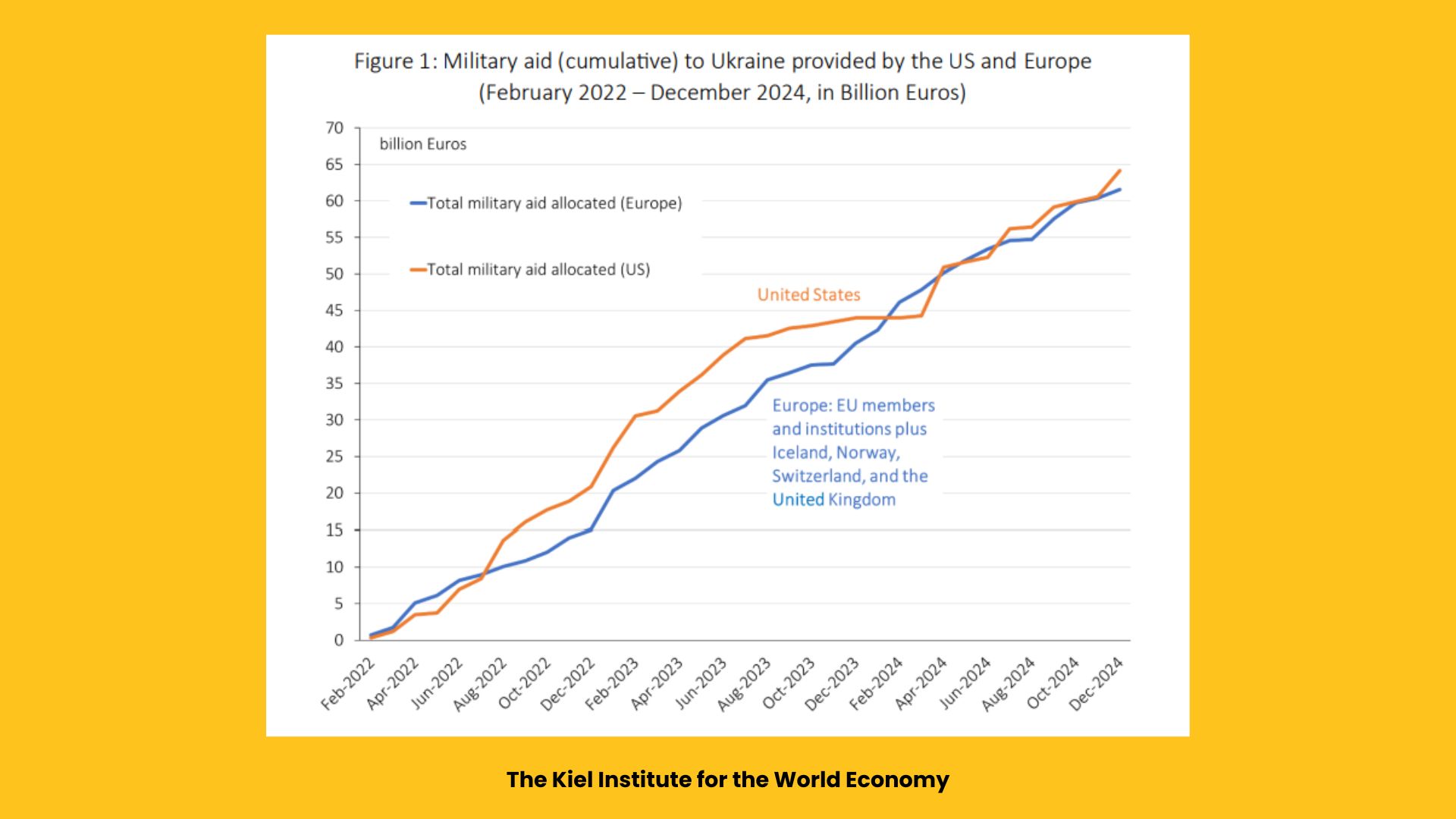 Regarding military aid, Europe's support of EUR 62 billion is at a similar level to that of the United States, which has allocated EUR 64 billion in total.
